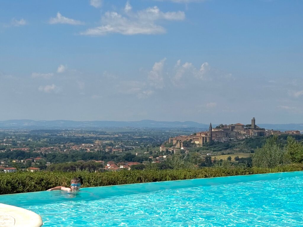 With arms folded over the edge of our pool, I’d trace the lines of its medieval walls and imagine the dozens of different flags flown over its battlement through the centuries: Arezzo, Perugia, Siena, Florence. I’d squint through the summer haze and try to picture what she might have looked like under feudal siege, a sea of glinting armor restless at her gates.